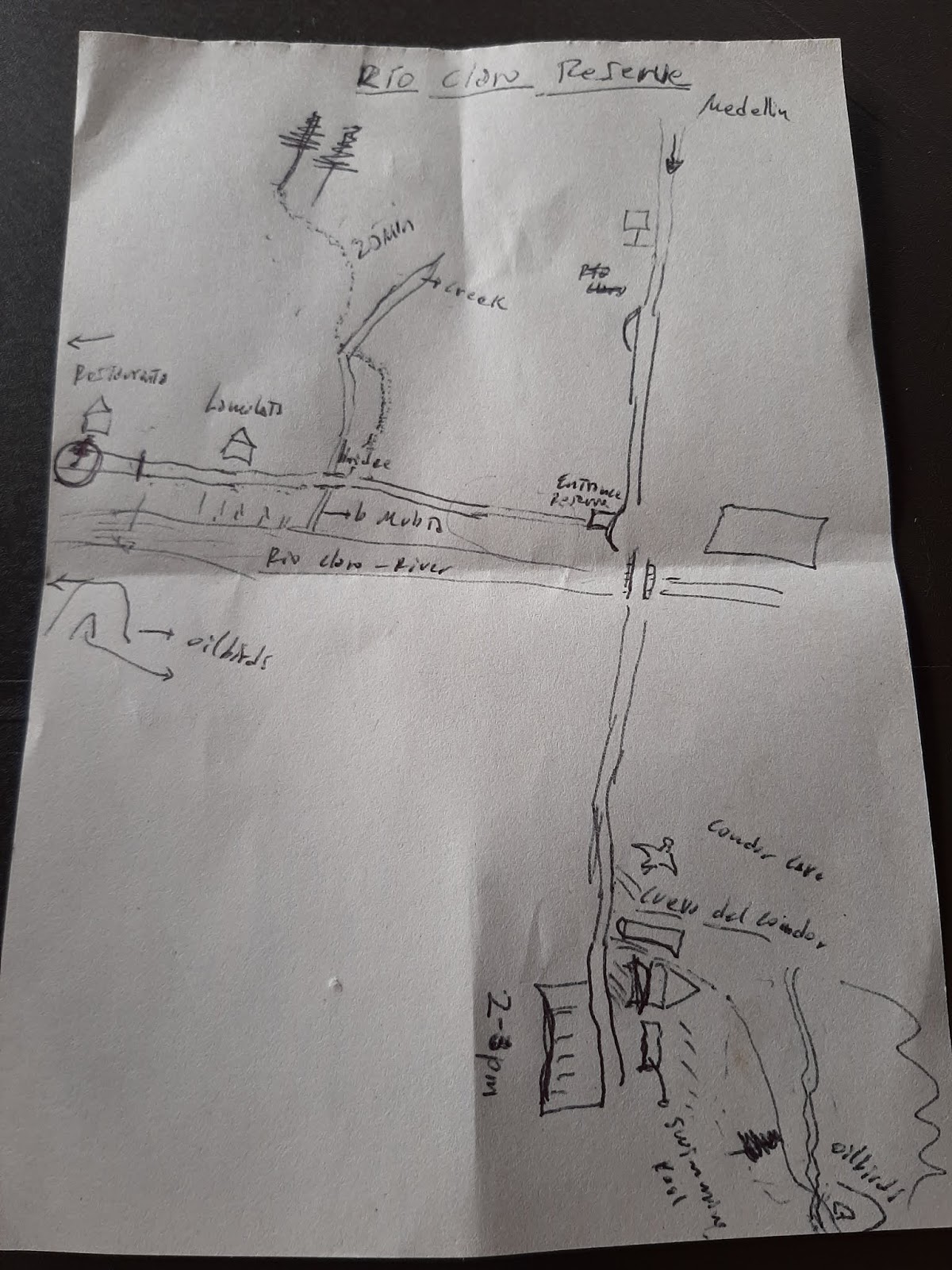 Thankfully, Edwin drew us a map of the reserve with places to bird so we had two options for the rest of the day: to go to the cave to see the Oilbirds or to walk the Mulata Trail in search of endemics. As much as we love the Oilbirds, we decided to try the trail partly because we heard that we would have to walk across waist deep Río Claro to get to the cave. Plus, seeing the endemics sounded more exciting to us than seeing the Oilbirds (no offense, Oilbirds!). What we didn't know was that the trail was guarded by three menacing dogs.... Well, not exactly "guarded"... There was a house right above the trail entrance and like everyone else in Colombia, the inhabitants of the house owned three guard dogs, mean dogs indeed. As we passed by the house, the dogs came running, barking and growling at us. Uh ah, terrified, we moved very slowly and quietly as not to provoke them any more than they already were and also made sure not to make any eye contacts. As soon as we were away from the house, the dogs left us alone. The trail was packed with beautiful yet obscure birds and it was really exciting and painfully frustrating at the same time to see them fritter away one after another without knowing their identity. Oh, how much we missed Edwin's presence. He would have been able name all the mystery birds we saw in a flash.